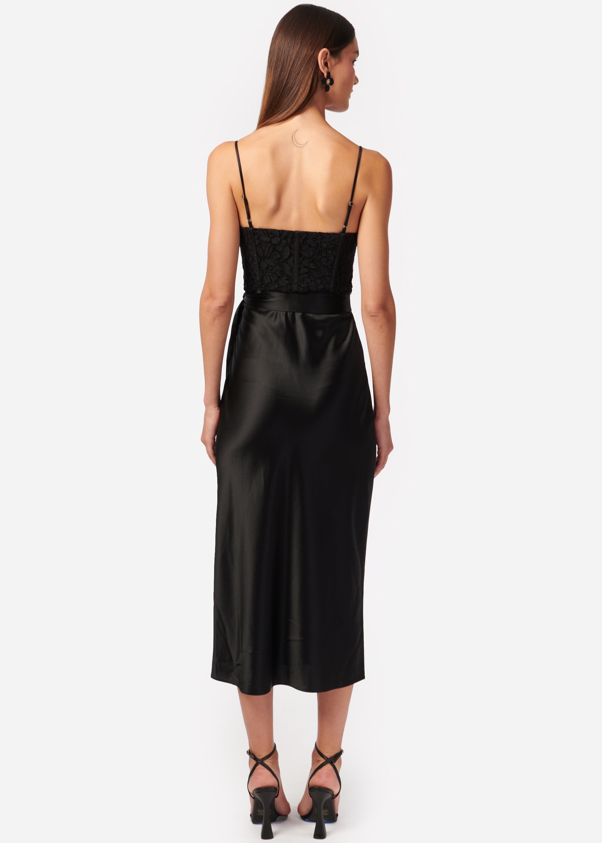 Faux wrap midi length slip dress with lace corset bodice
