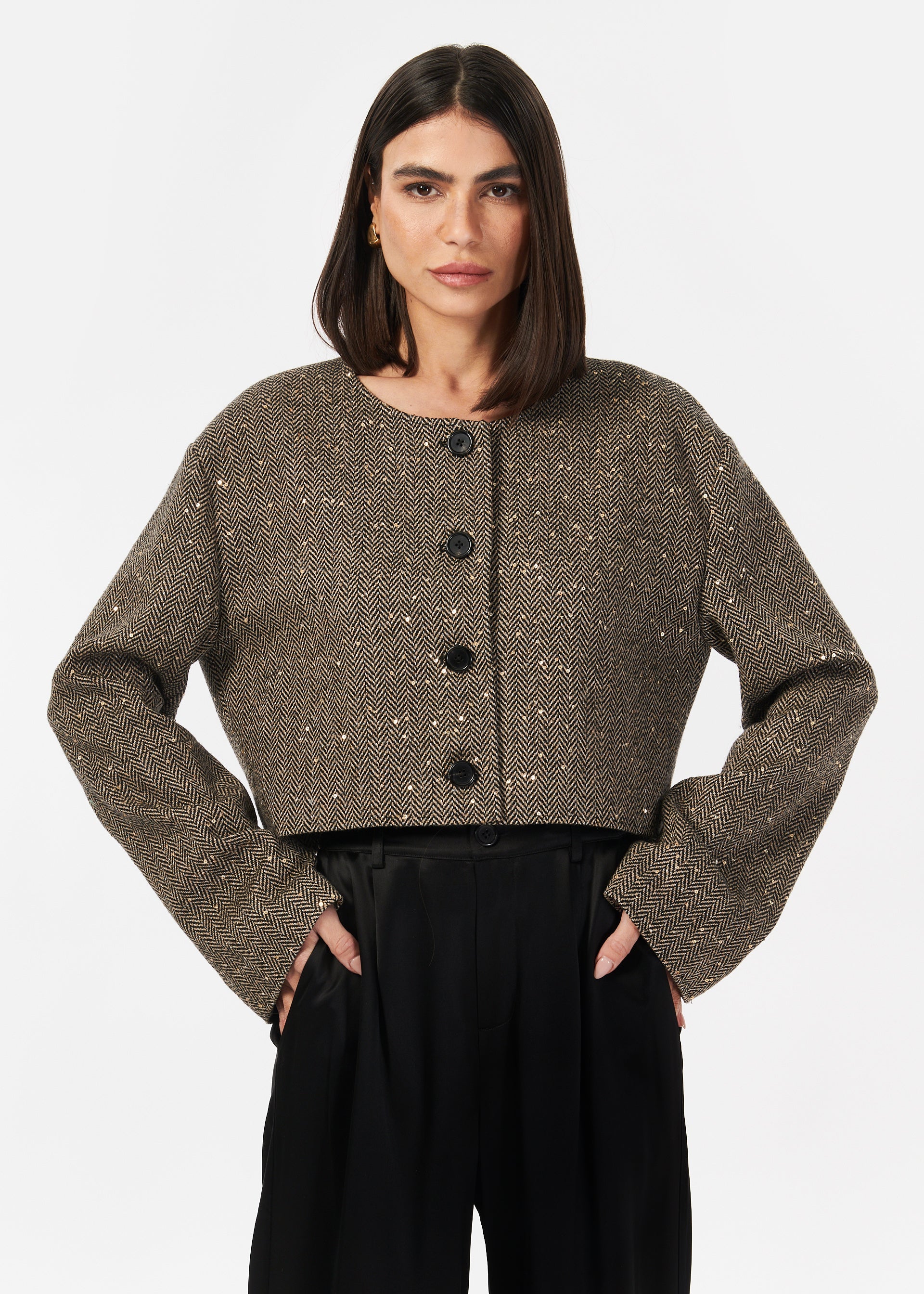 Serrano Sequin Tweed Cropped Jacket Black and Tan